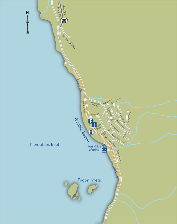 Port Alice is located roughly 45 minutes from both Port McNeill and Port Hardy via Highway 30, which is paved.